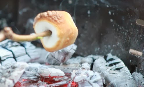 Die Marshmallows einfach mit einem Stock über der Glut etwas anbräunen und dann zwischen die Kekse packen.
